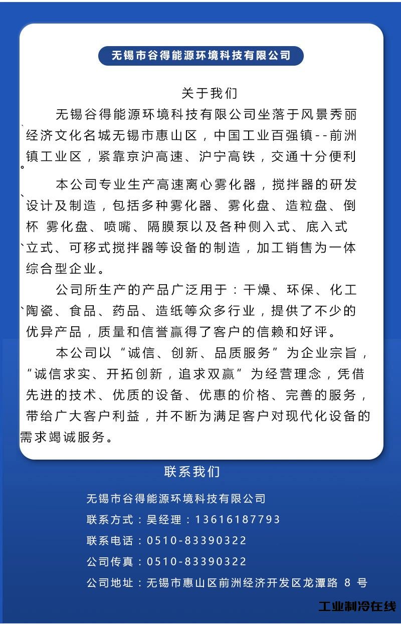 无锡谷得能源环境科技有限公司专业生产高速离心雾化器,搅拌器的研发、设计及制造,包括多种雾化器、雾化盘、尼鲁雾化盘、ks雾化盘、西格斯雾化盘